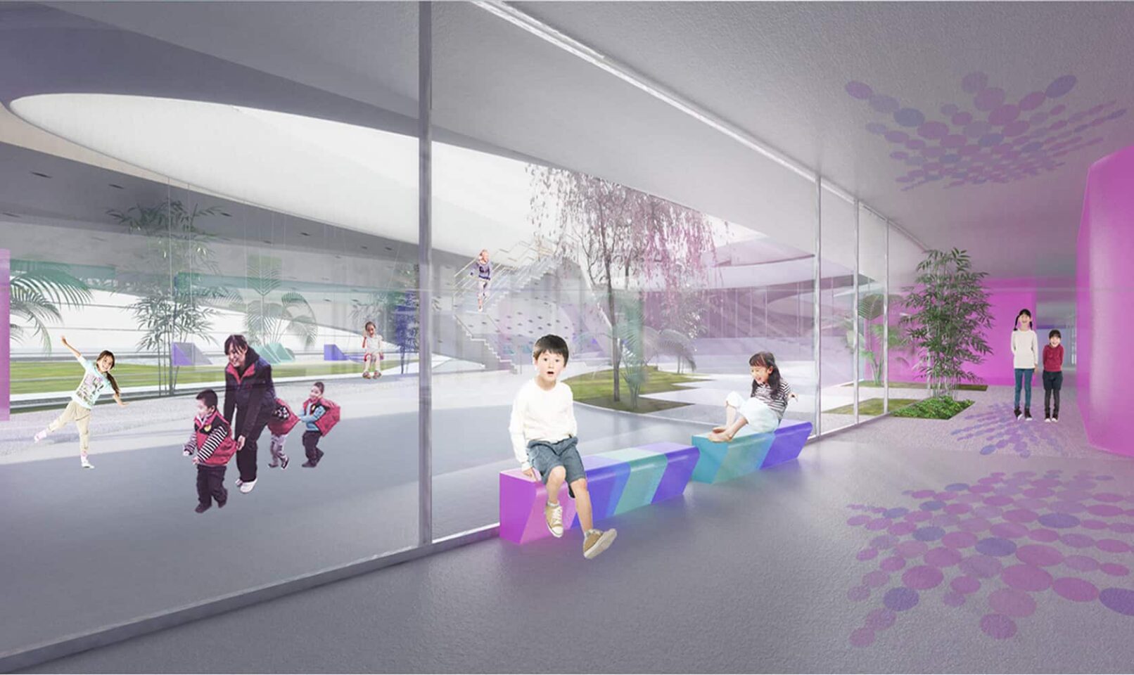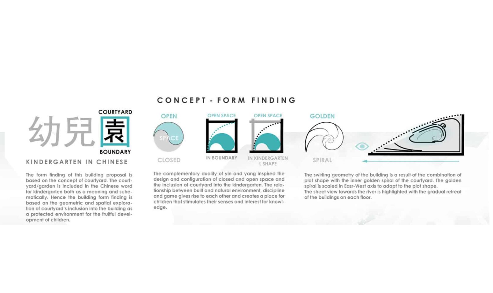 The kindergarten is integrated in the natural and urban environment, complementing the existing infrastructure and facilities of Ruichang city and creating projections of culture which will attract the attention, interpretation and discussion of visitors and residents. The complementary duality of yin and yang inspired the design and configuration of closed and open space, creating a dynamic dialogue between these interrelated worlds. This relationship between built and natural environment, discipline and game, gives rise to each other creating a place for children that stimulates their senses and interest for knowledge.