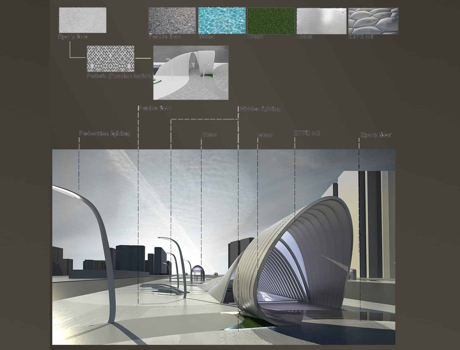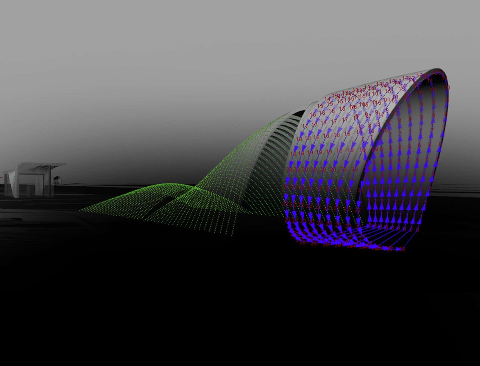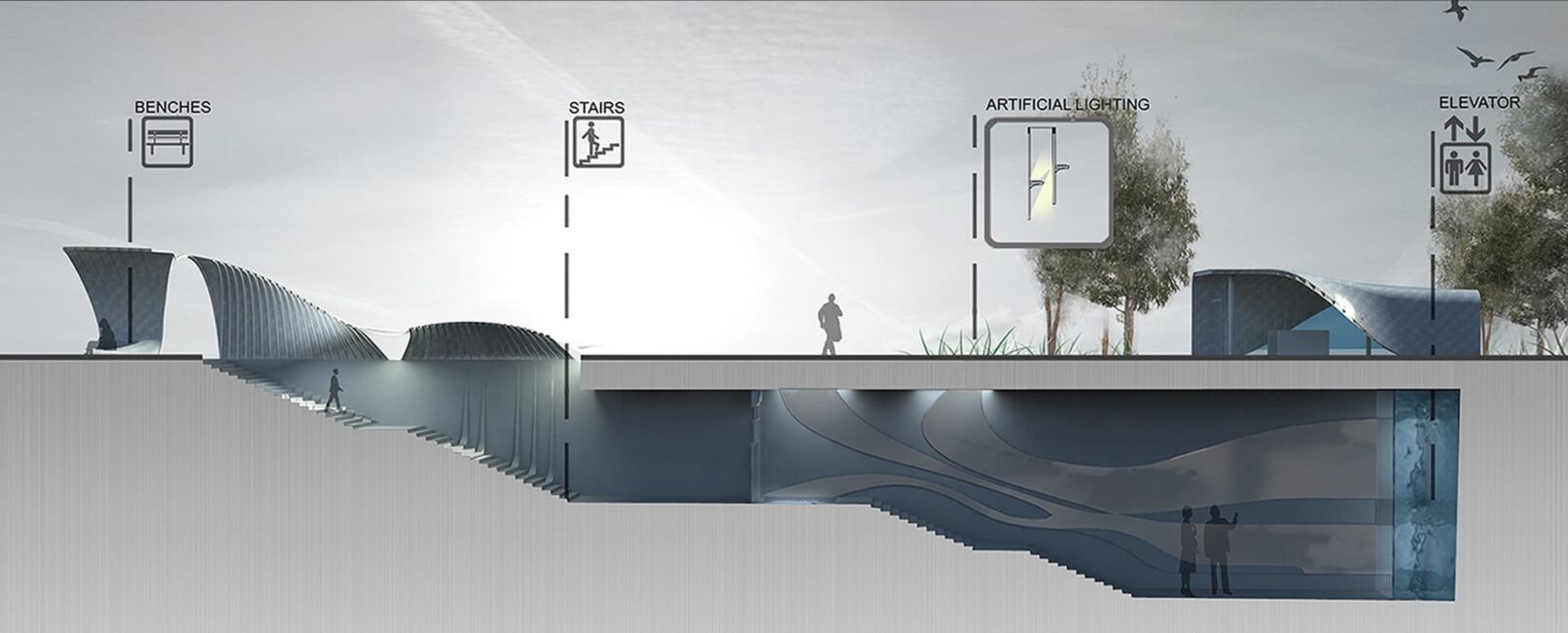 The Pavilions’ design guidelines were based on the form-finding strategy of active bending and on the diffused lighting. The proposed arches configure staircases’ and elevators’ entrances with an inviting descending gesture. The arches’s grid originates from staircase steps while their top is differentiated according to light. The curvilinear arches take the optimum form in space and further optimization is realized with the use ofstructural analysis software integrated in the design software in the preliminary stage of design.